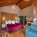 Værelset har et køkken køkken samt et tekøkken og en spiseplads. Disse værelser har et privat badeværelse og kan bryste sig af udsigt over haven.